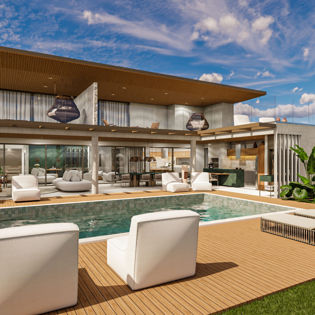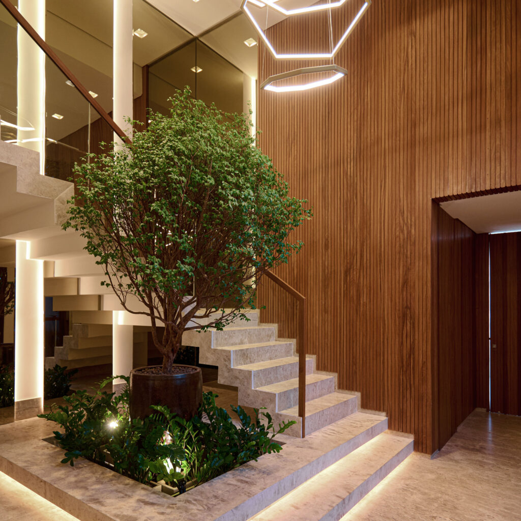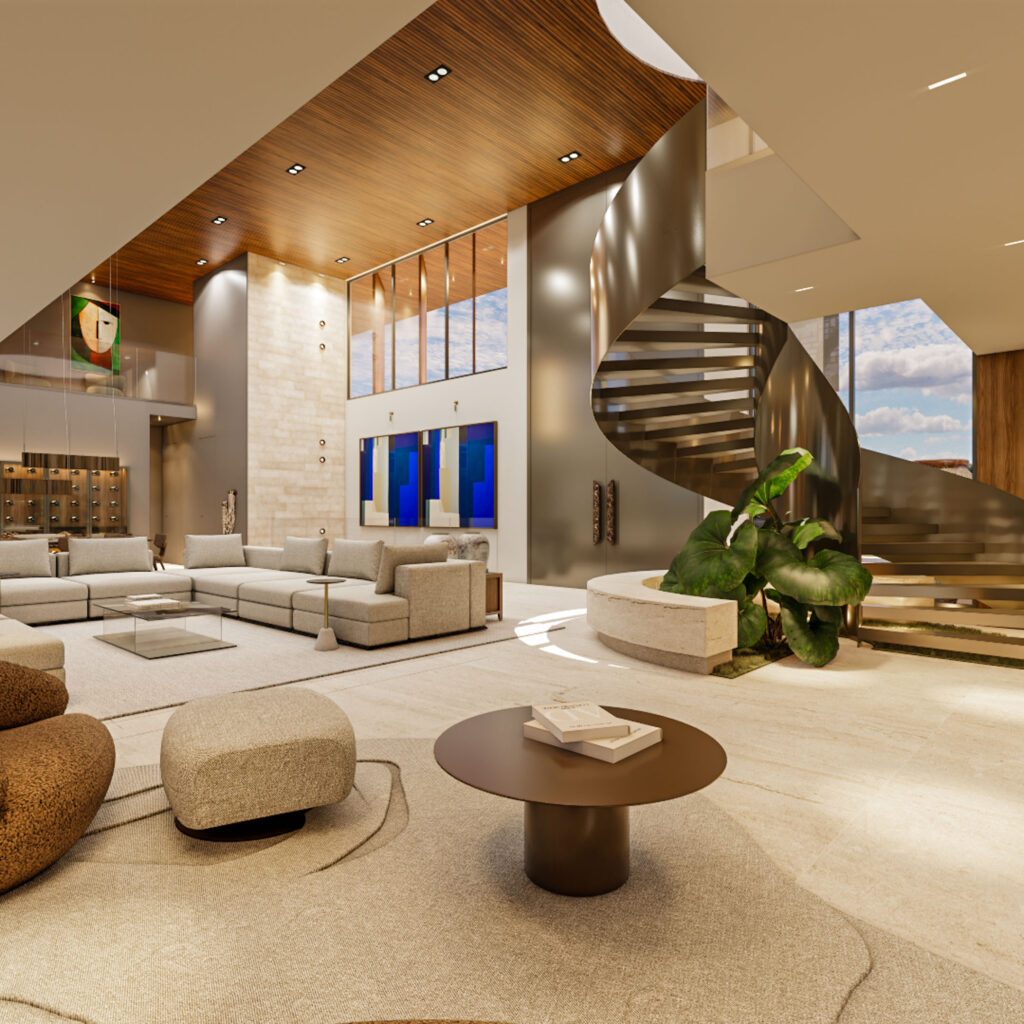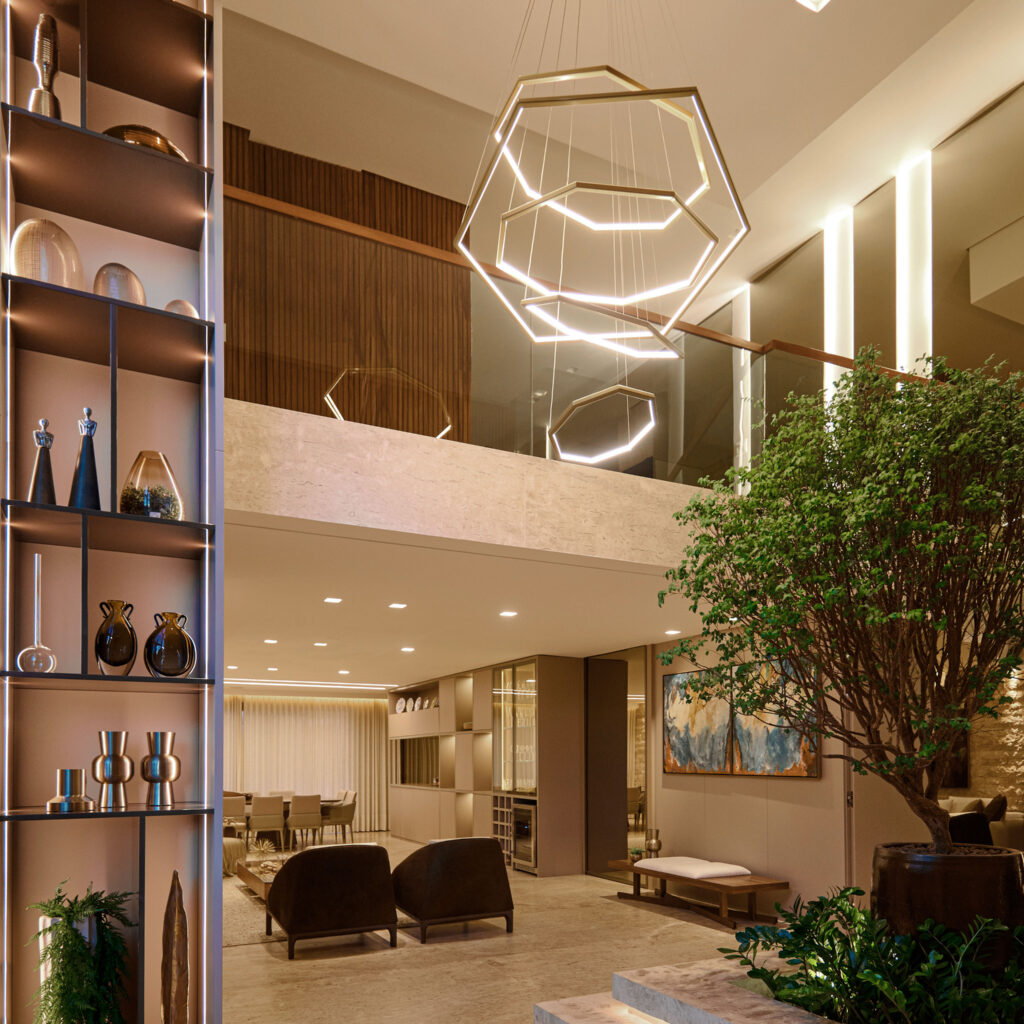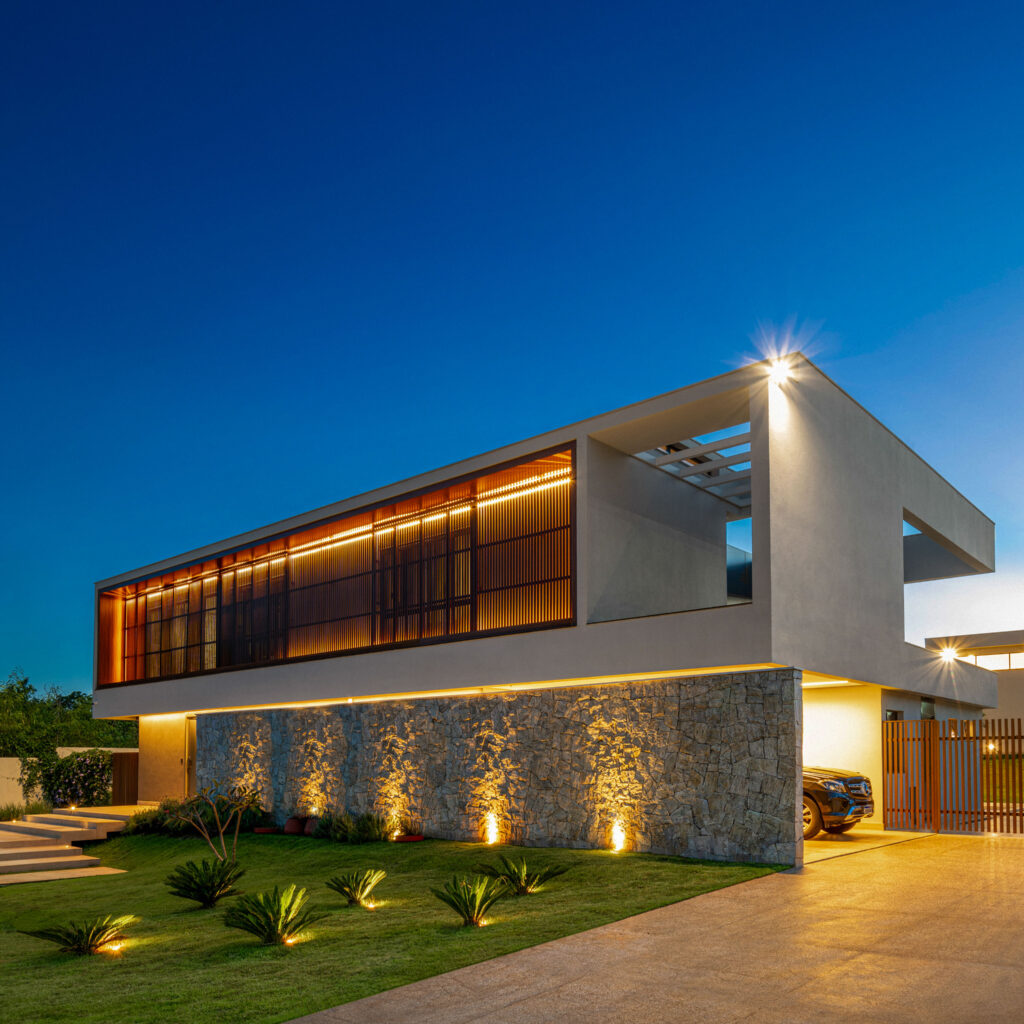 Reflete a essência da arquitetura contemporânea, unindo volumetria imponente, integração com o paisagismo e um equilíbrio preciso entre textura, iluminação e materiais de alta qualidade.