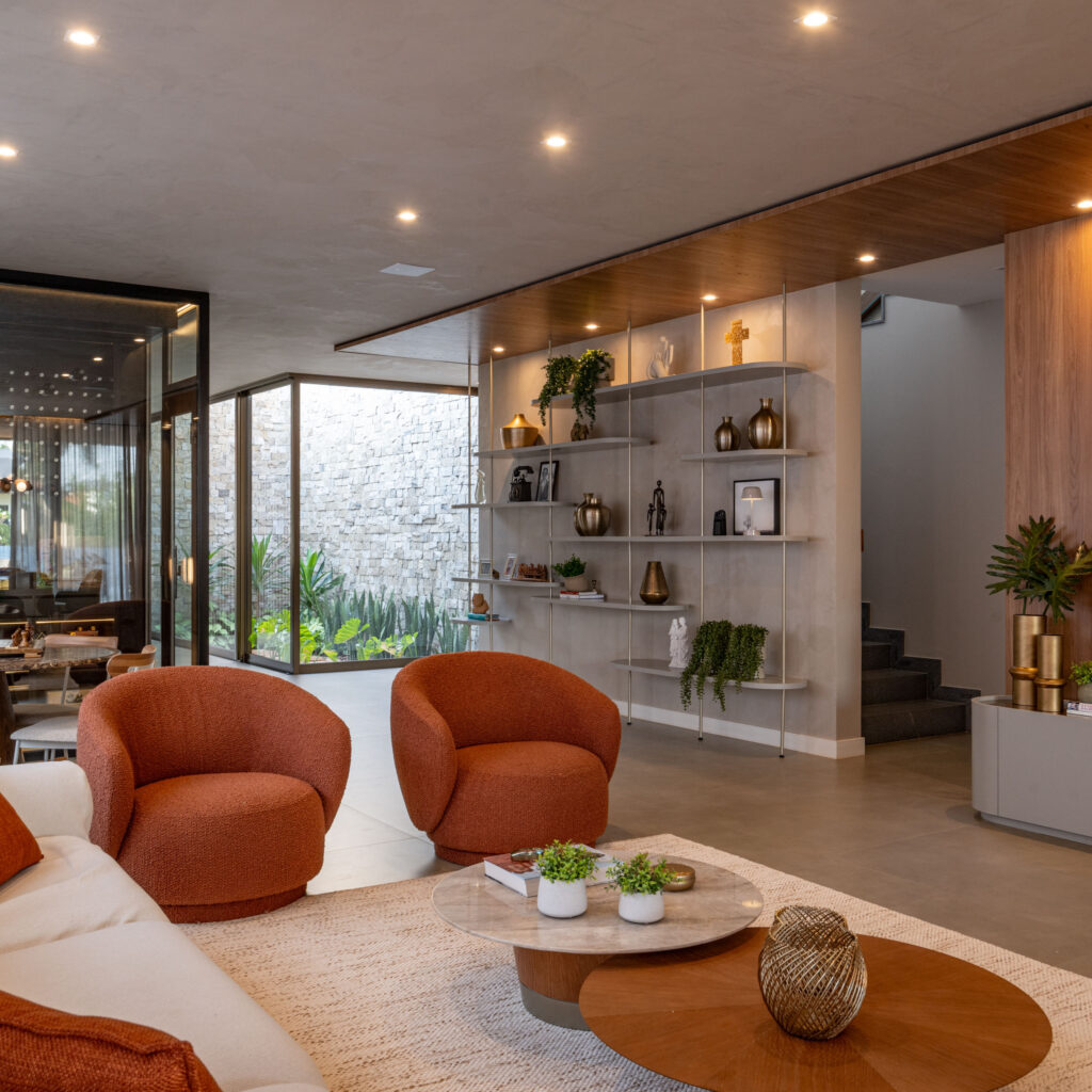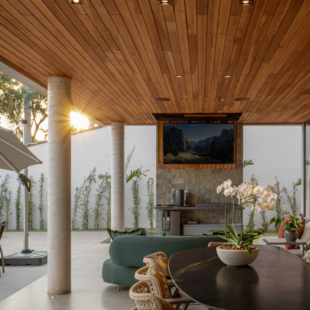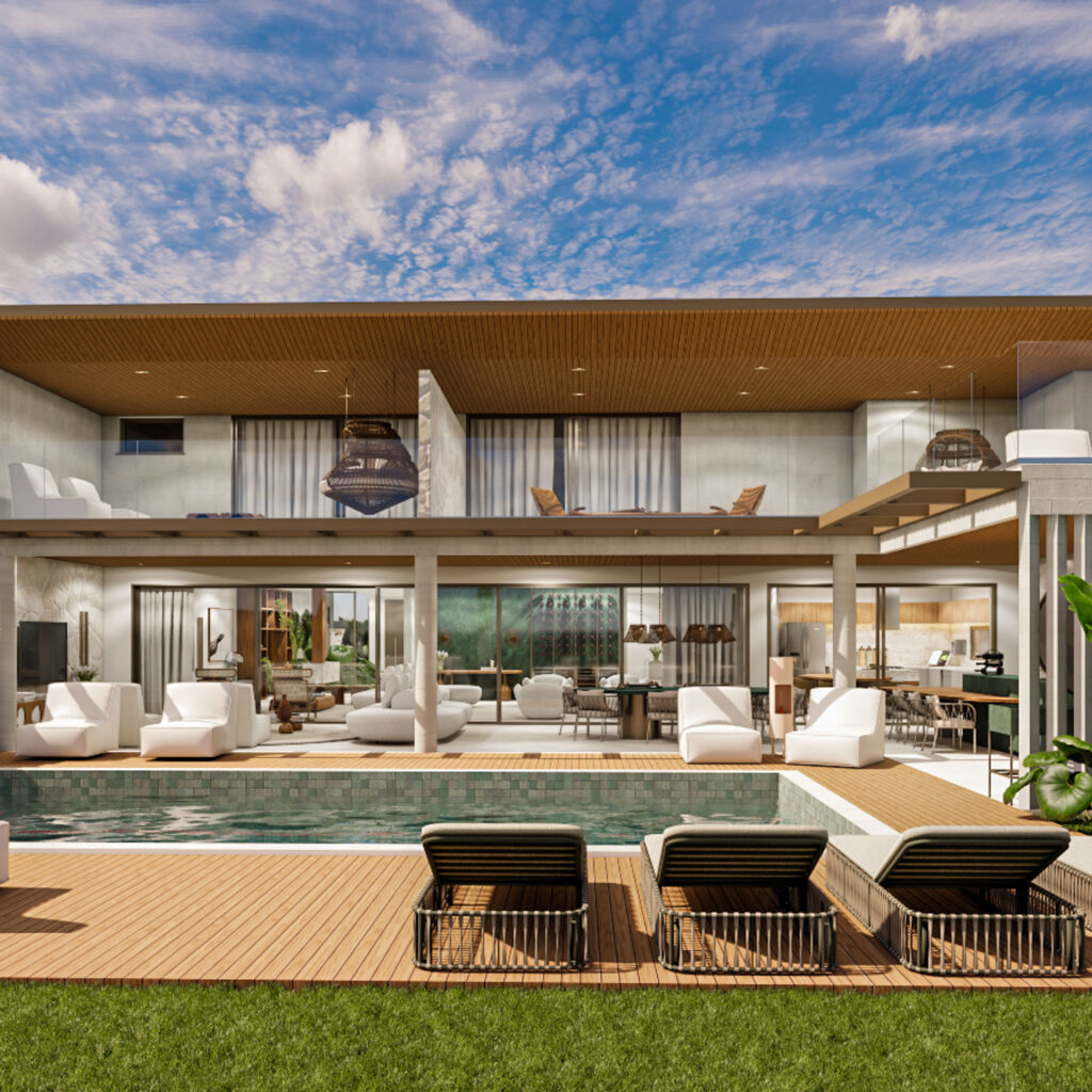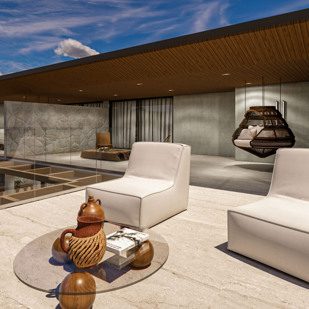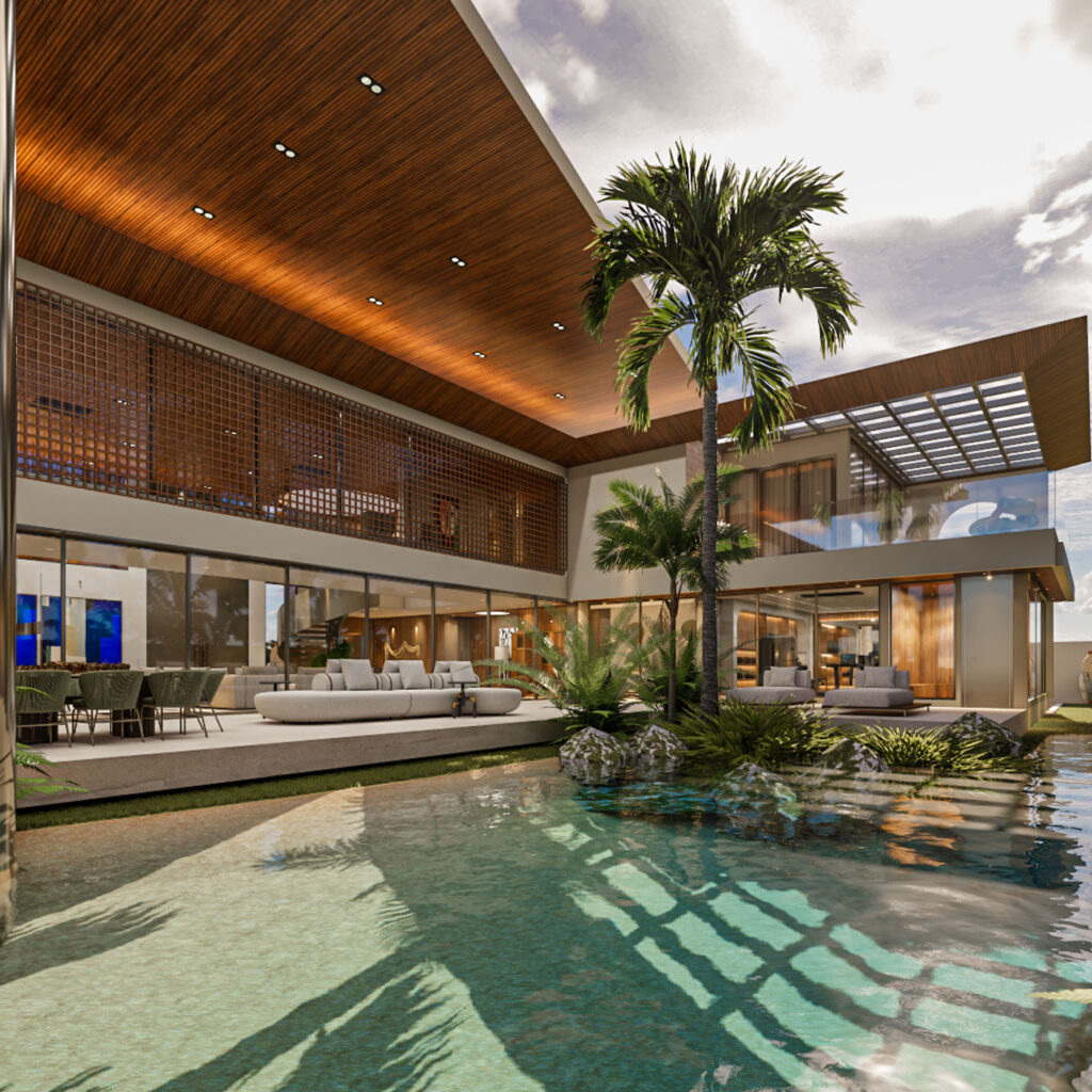 Reflete a essência da arquitetura contemporânea, unindo volumetria imponente, integração com o paisagismo e um equilíbrio preciso entre textura, iluminação e materiais de alta qualidade.